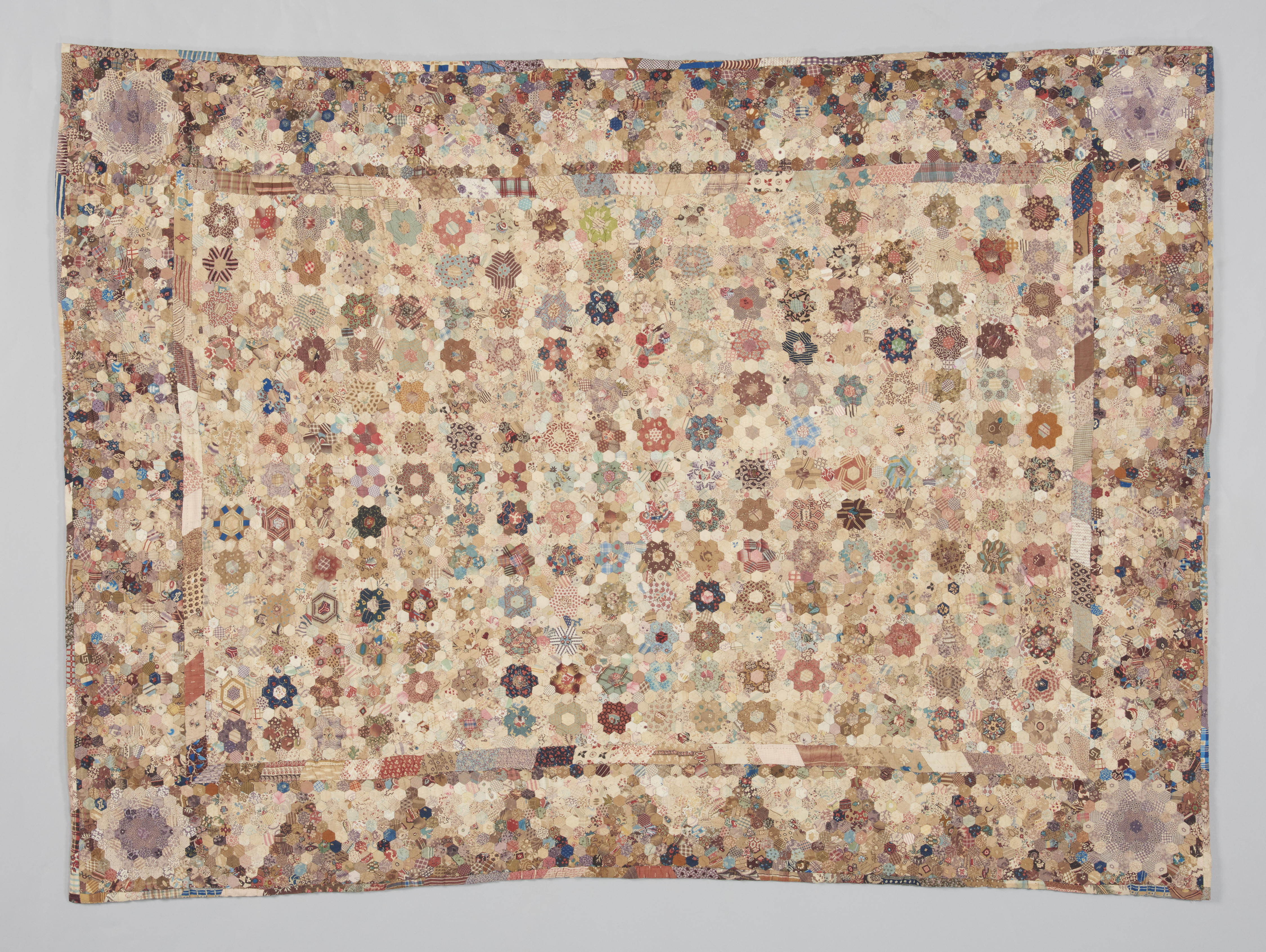 Een lappendeken met een bovenzijde die is gemaakt van kleine zeshoekjes van diverse bedrukte katoen. De deken heeft een duidelijk patroon in het lapjeswerk: een groot middenveld met rozetjes van elk zeven lapjes op een fond van lichtere kleuren, en een 18 centimeter brede rand met donkere en lichte driehoekige punten, met in de hoeken ...