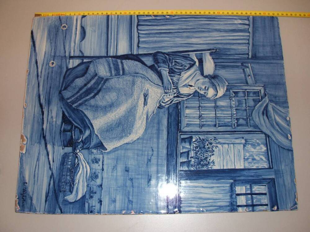 Plaat, rechthoekig, staand, blauw met interieur met vrouw, die een deken omzoomt, gesigneerd: E. Wijkstra. Een voluit gesigneerde plaat is zeldzaam.