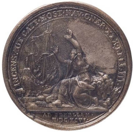 keerzijde: Hollandse maagd, met armenin wanhoop omhoog, leunend tegen liggende Nederlandse leeuw met pijlenbundel, schip op de achtergrond
