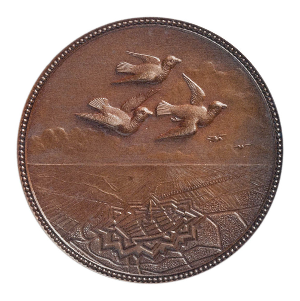 keerzijde: vijf duiven vliegen over een landschap waarin een versting is gelegen, omgeven door een parelrand