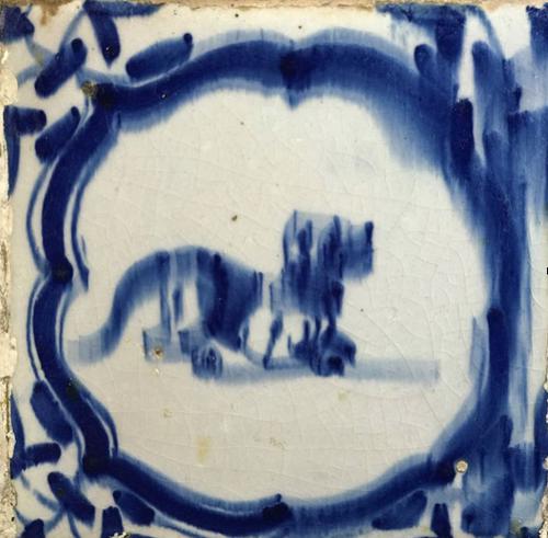 Tegel van aardewerk met tinglazuur voorstellende Hon...