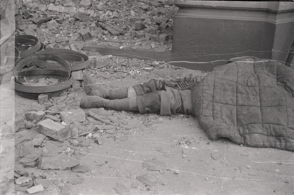 Met deken overdekt lijk tussen puin na een bombardement