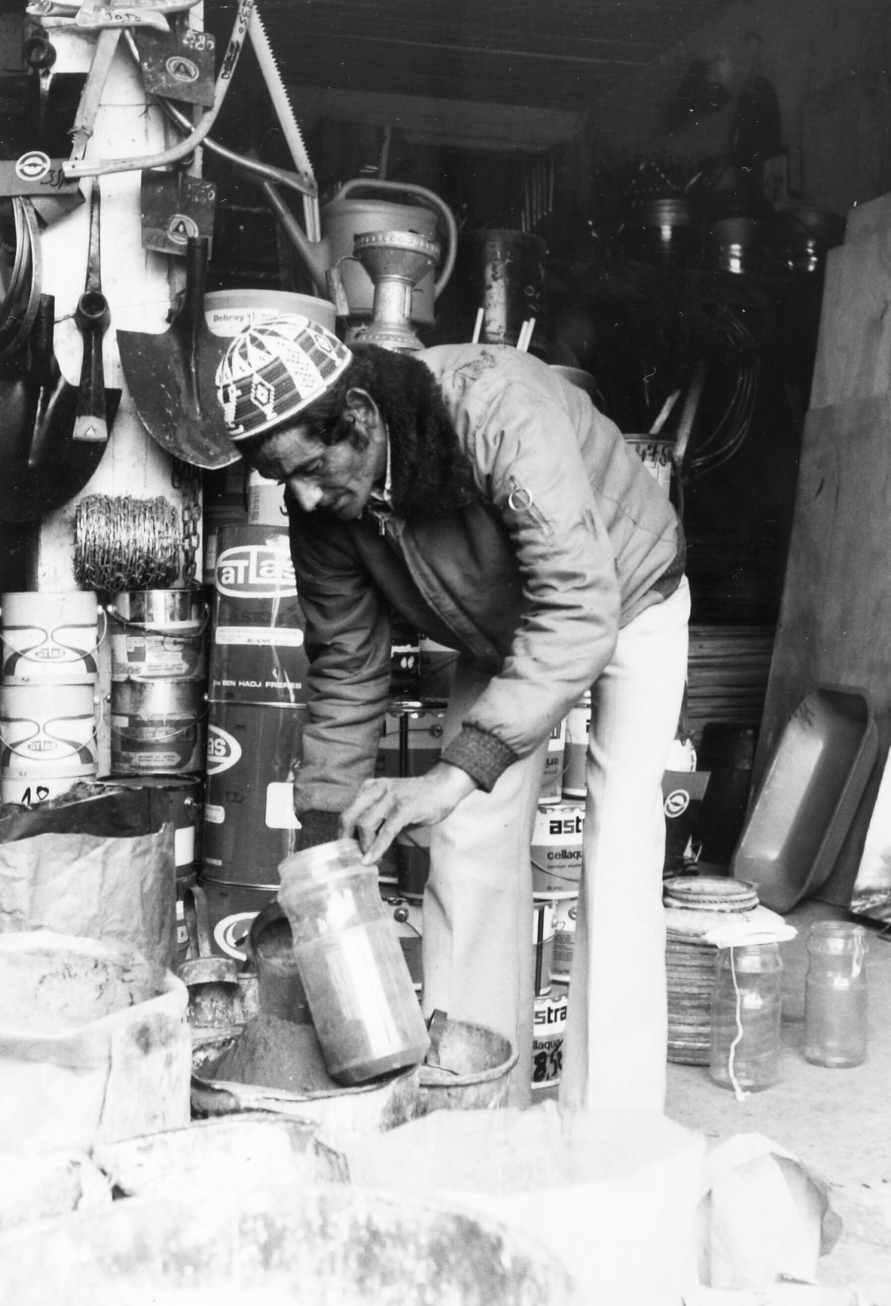 Het afmeten van verfpoeder in een ijzer- en verfwinkel