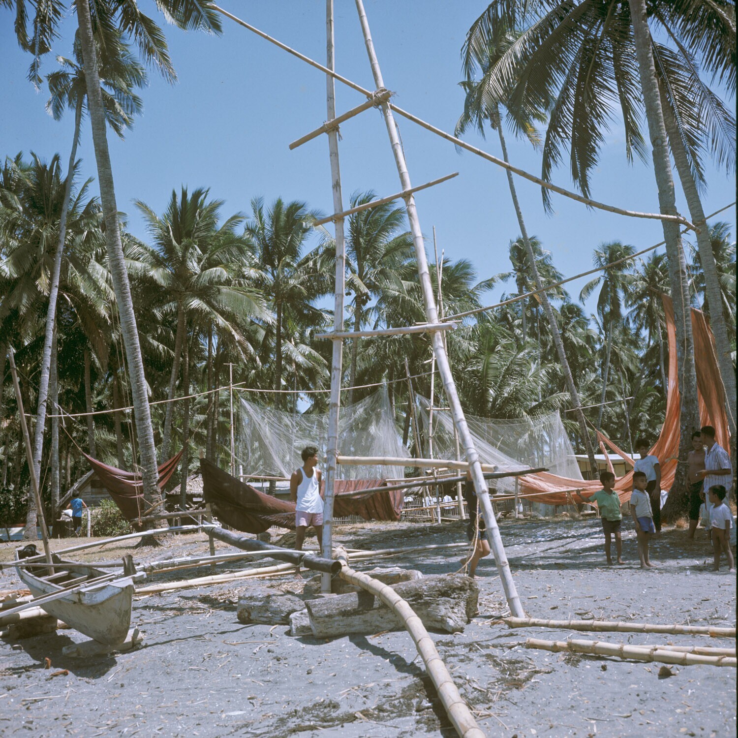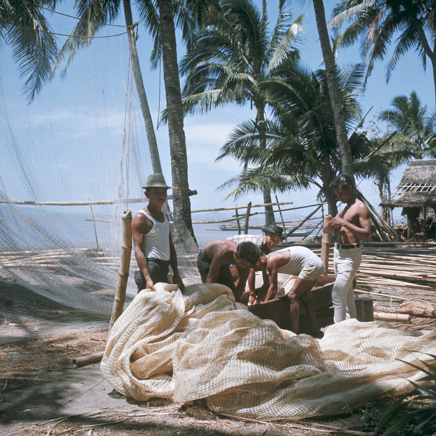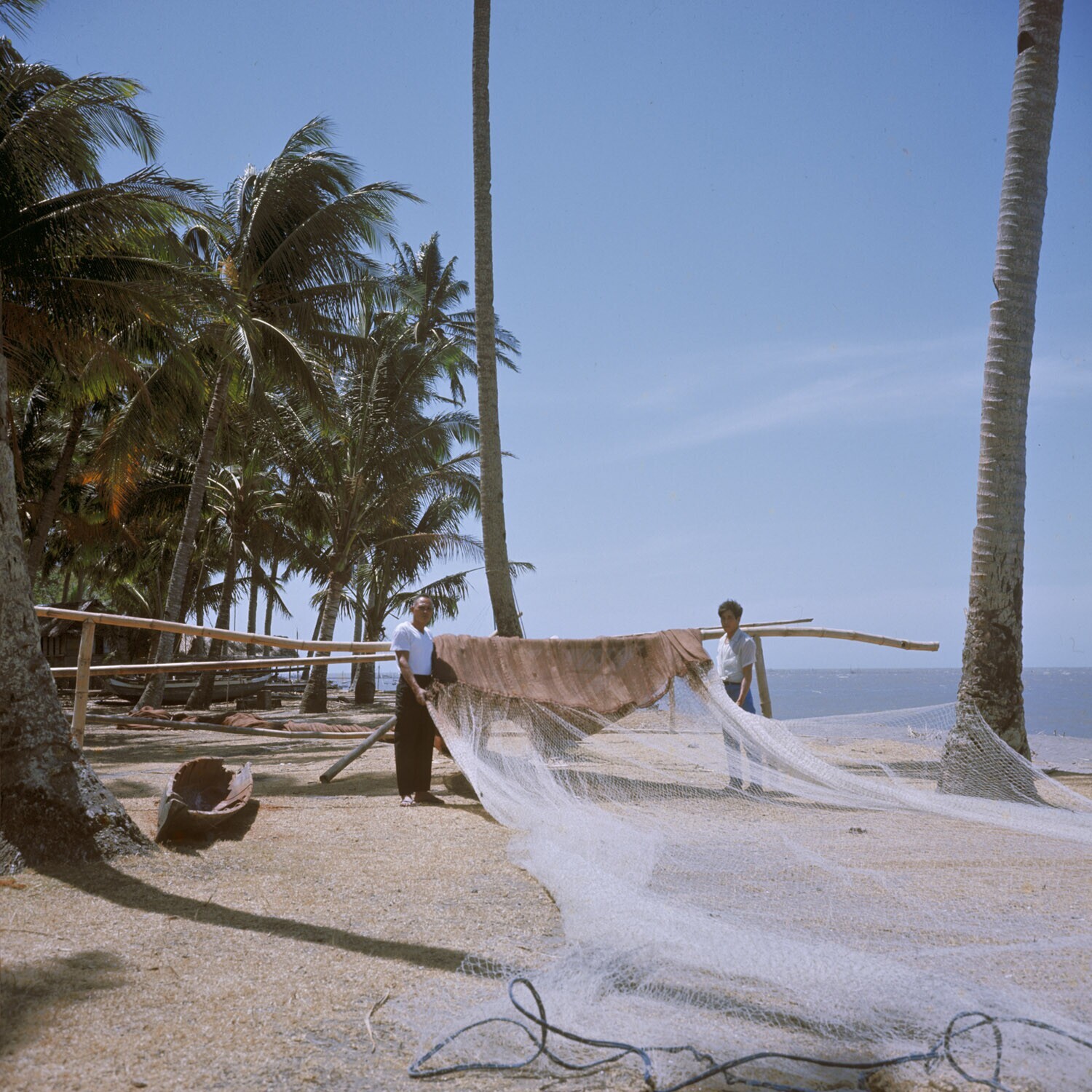 Visnetten worden te drogen gehangen op het palmenstr...