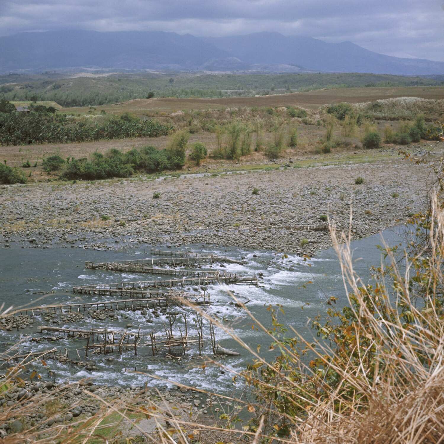 Visfuiken in de rivier, bij de stuwdam in aanbouw vo...