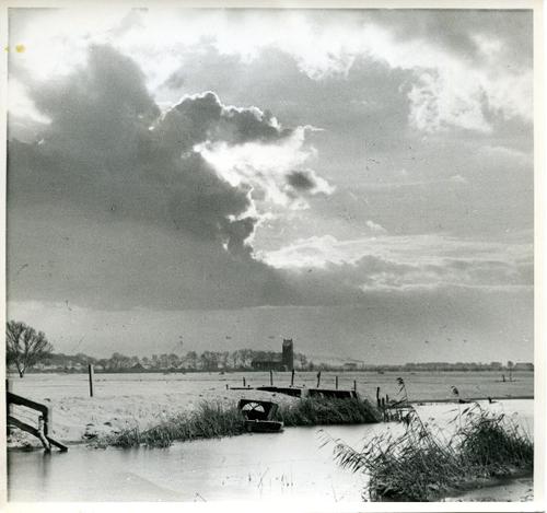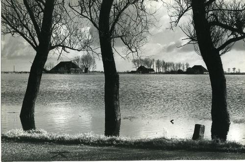Foto in zwart-wit van ondergelopen land met boerderi...