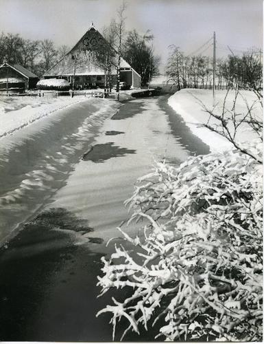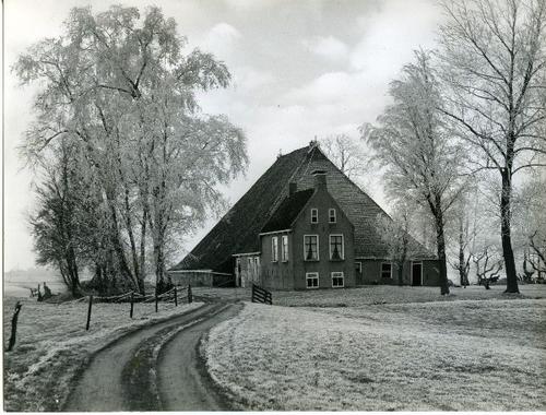 Foto in zwart-wit van een kop-hals-rompboerderij met...