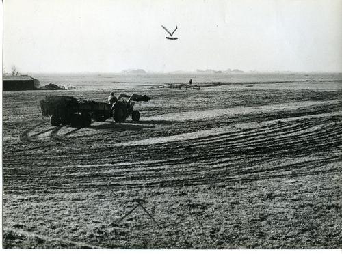 Foto in zwart-wit van de koekenperserij in een veevo...