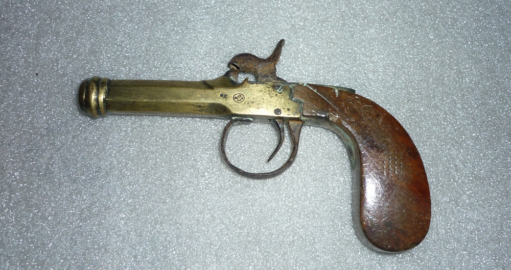 Pistool, van metaal met handvat van hout, een enkels...