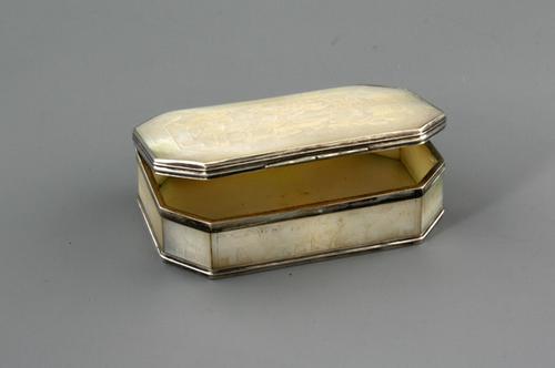 Snuifdoos, gesneden parelmoer met zilveren montuur