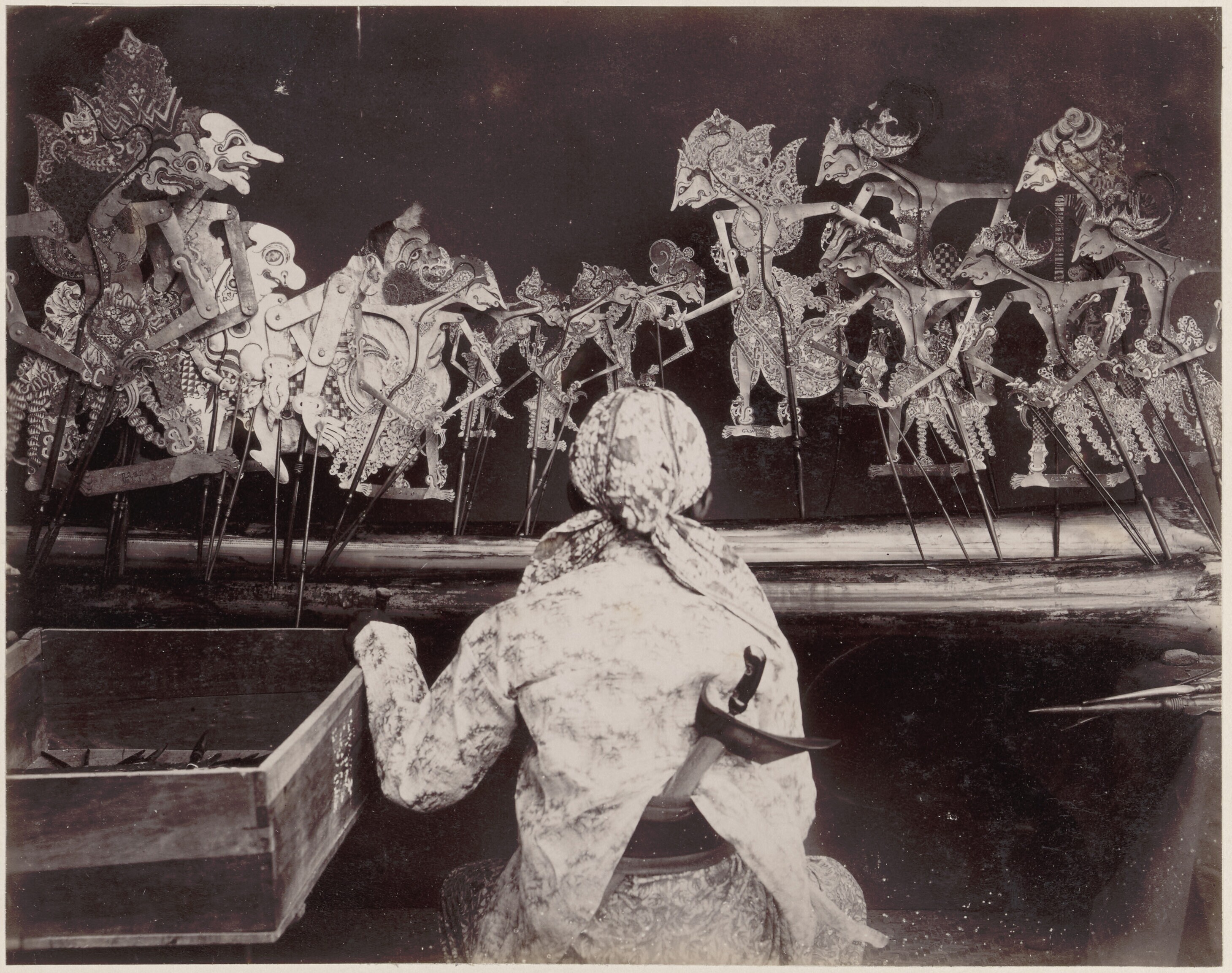 Een poppenspeler tijdens een wajang kulit voorstelling