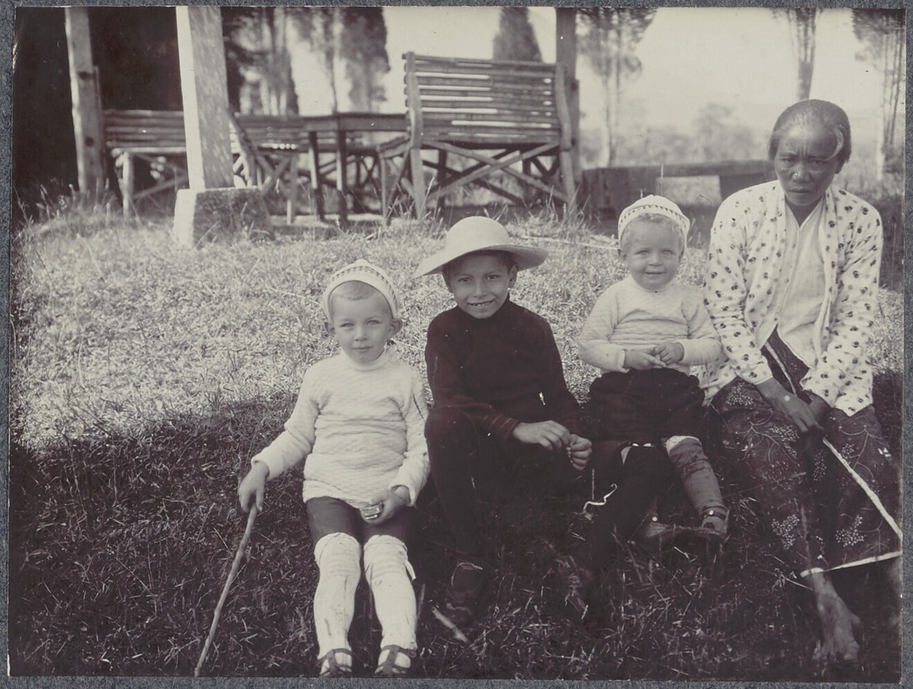 Vrouwen, kinderen en kinderverzorgster tijdens een b...
