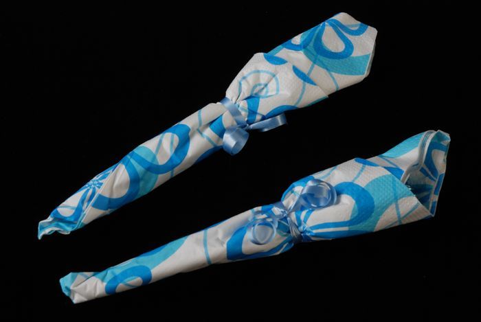 Bestek in blauw-wit papier ingepakt