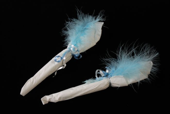 Bestek in wit papier met blauwe veer ingepakt