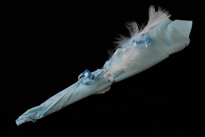 Bestek in lichtblauw papier met witte veer ingepakt