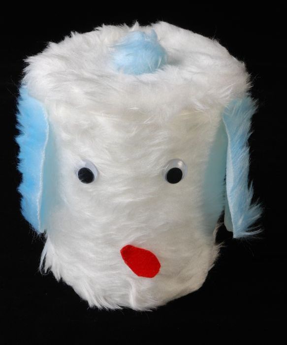 Pot met deksel, versierd als hond met snoepjes