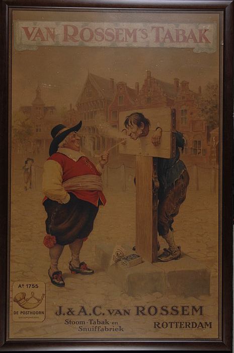 Reclamebord met drie rokende matrozen in een boot me...