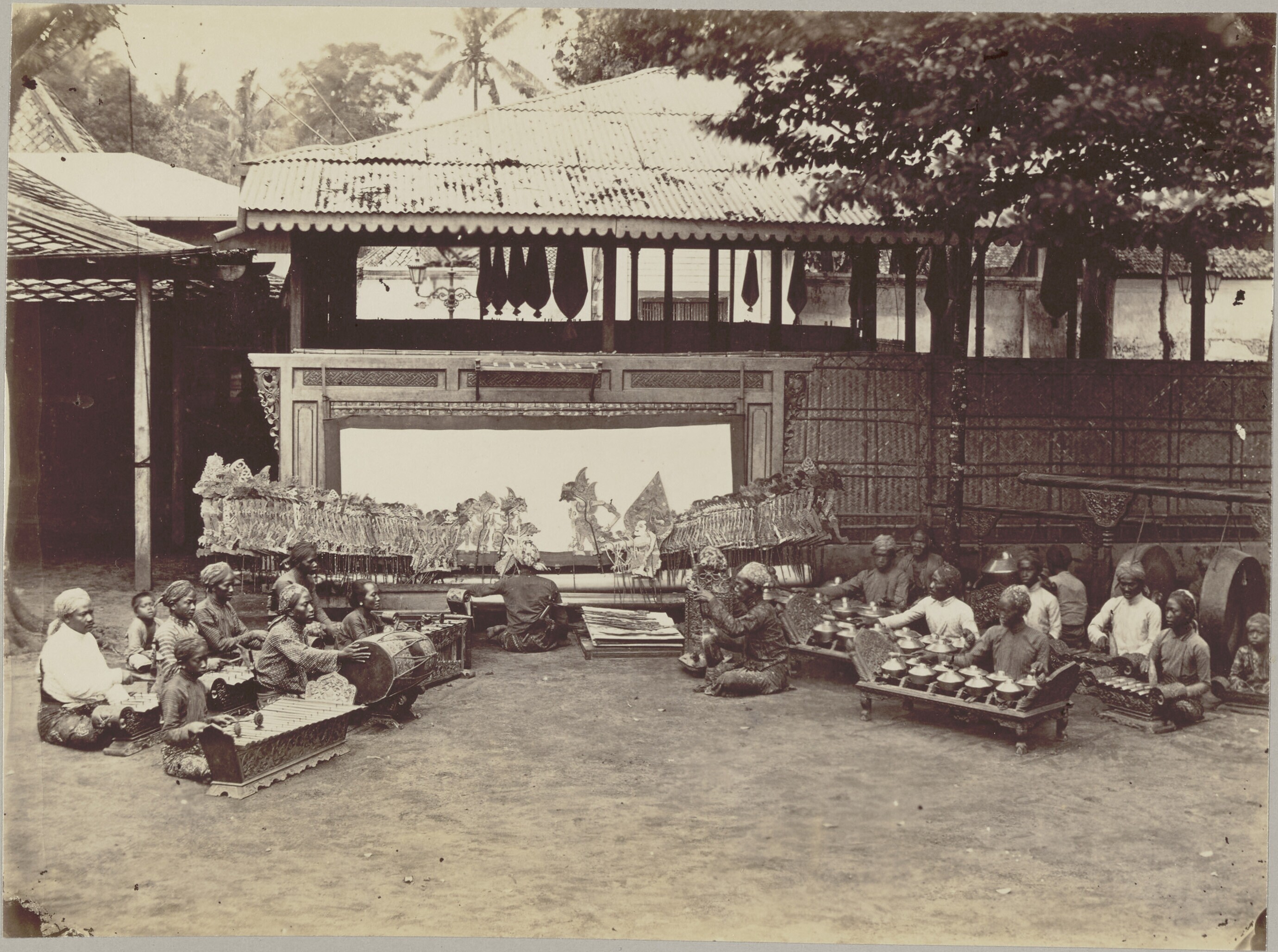 Wajang kulit performance accompanied by a gamelan or...
