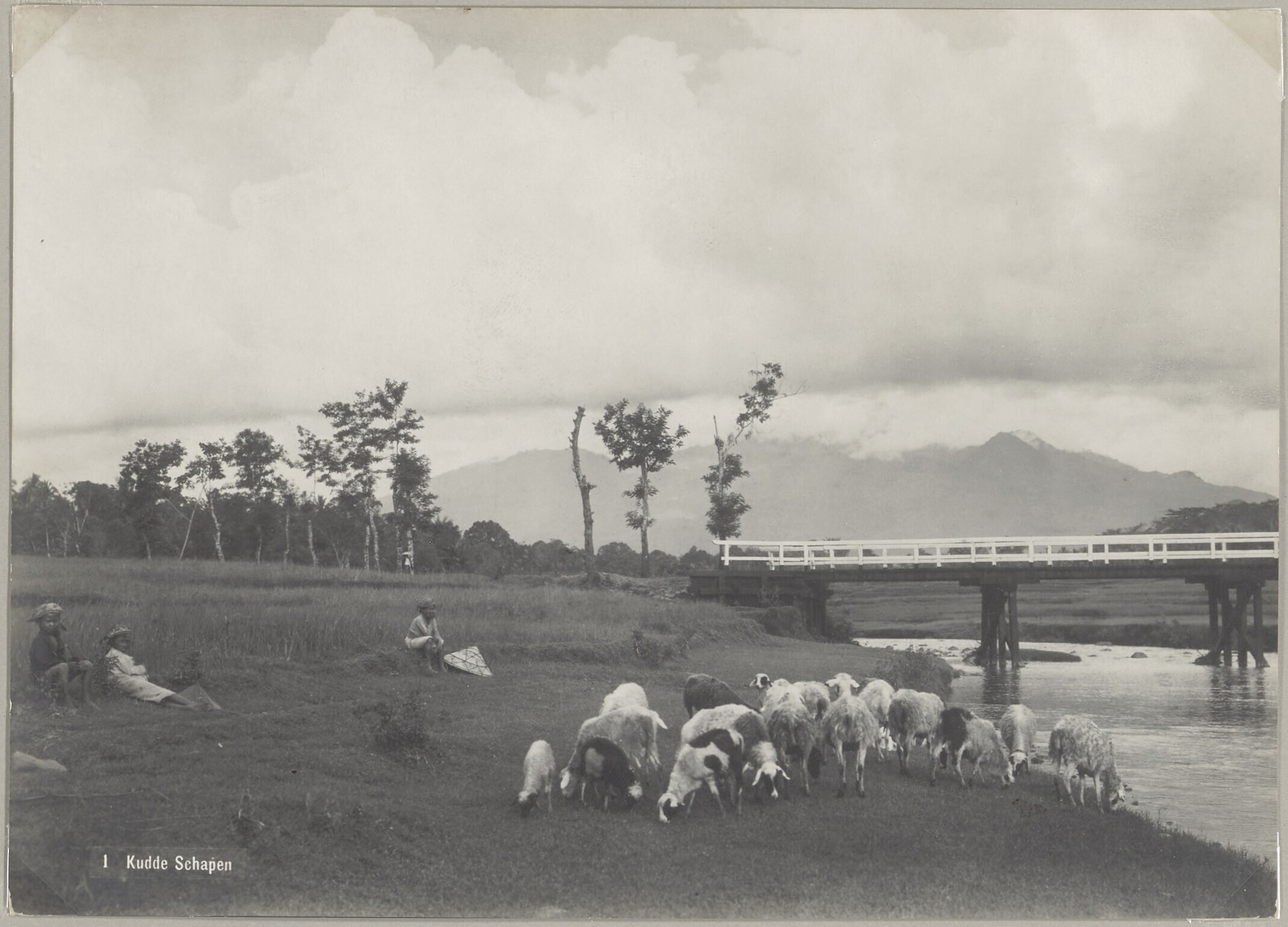Javaanse kinderen langs de rivier met een kudde schapen