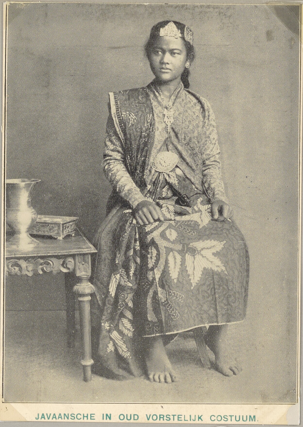 Studioportret van een als een vorstin geklede Javaan...