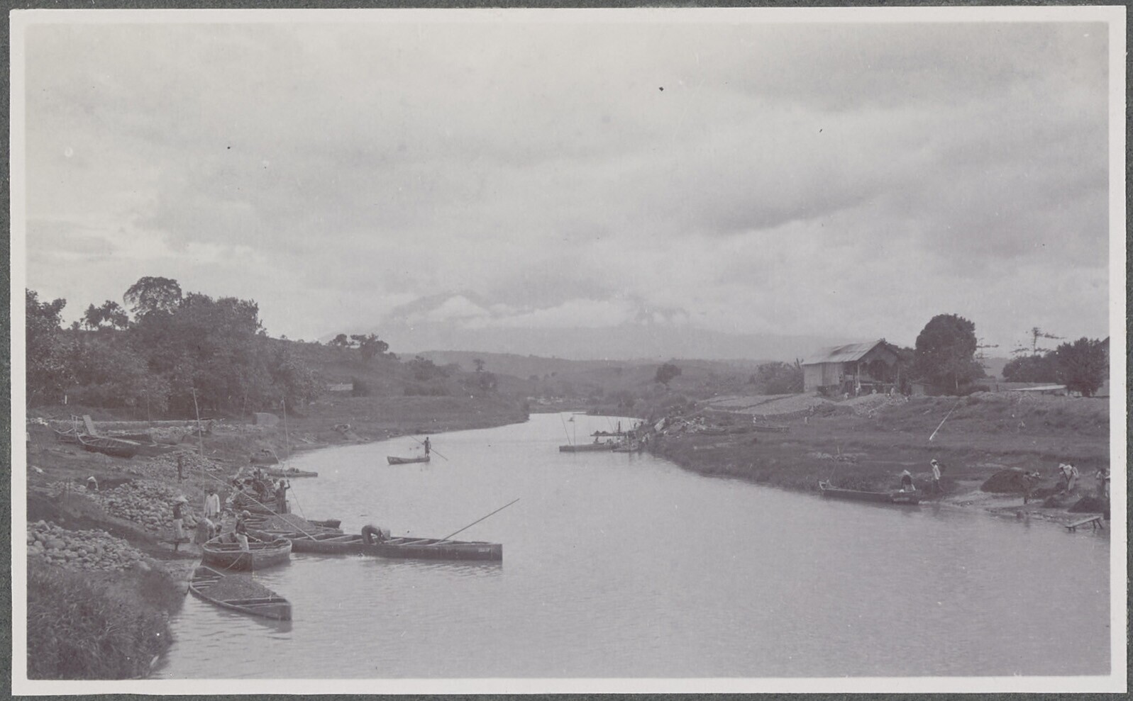 Riviergezicht met prauwen die geladen of gelost word...