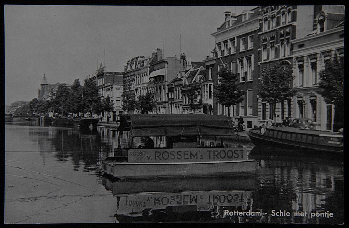 Briefkaart met pontje op de Schie met "v. ROSSEM TRO...