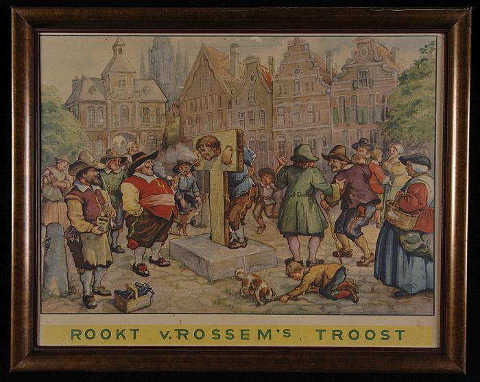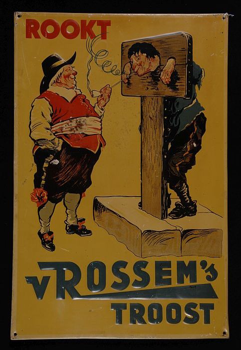 Reclamebord met man aan schandpaal met "van Rossem´s...