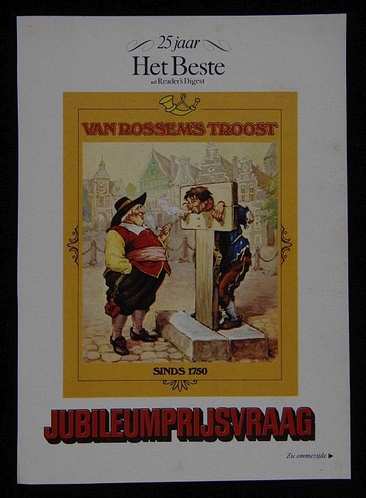 Flyer met man aan schandpaal en "Van Rossems TROOST ...