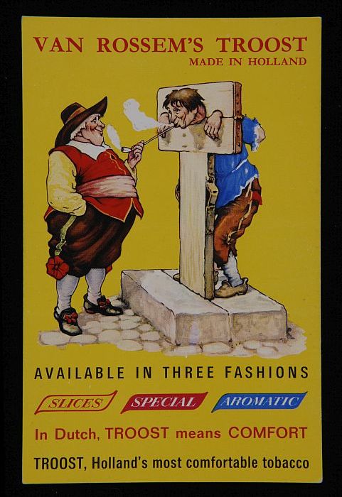 Reclamebord met man aan schandpaal met "rookt v. Ros...