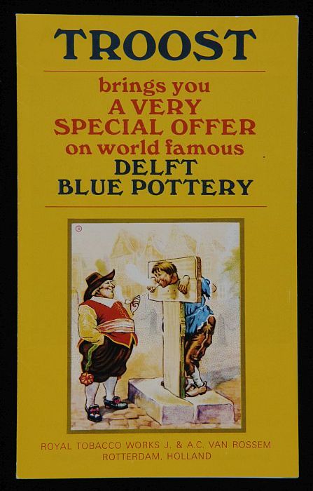 Flyer met man aan schandpaal met "Troost" en "Delft ...