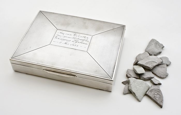 Zilveren doos met inscriptie Lijnbaan, met stukjes k...