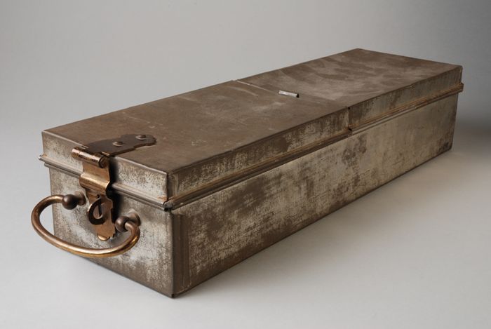Blikken doos met koperen handvat en hangslot