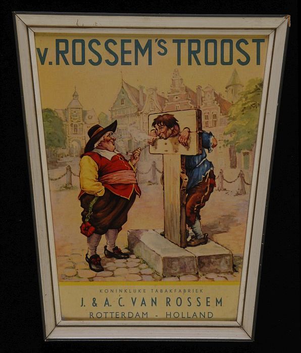 Reclamebord met "v. Rossem's troost", in houten lijst