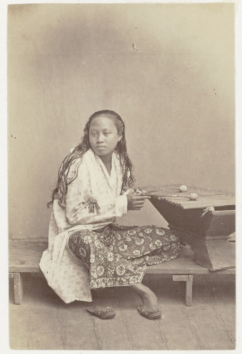 Een Javaanse vrouw bespeelt een instrument uit een g...