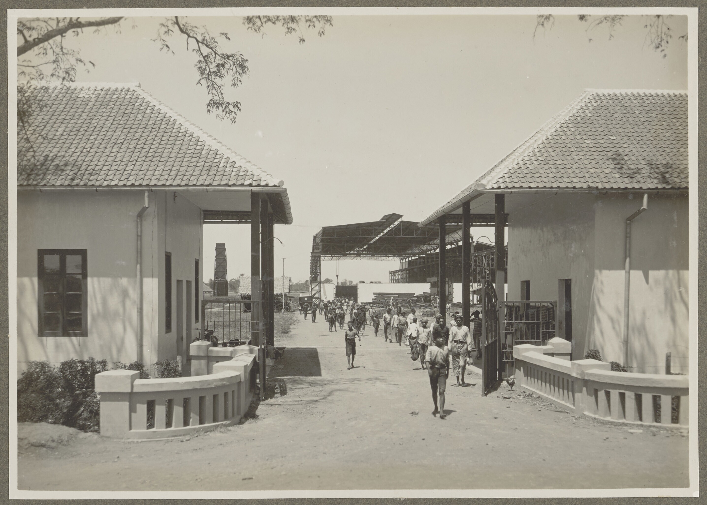 Arbeiders komen uit de fabriekspoort van een metaal ...