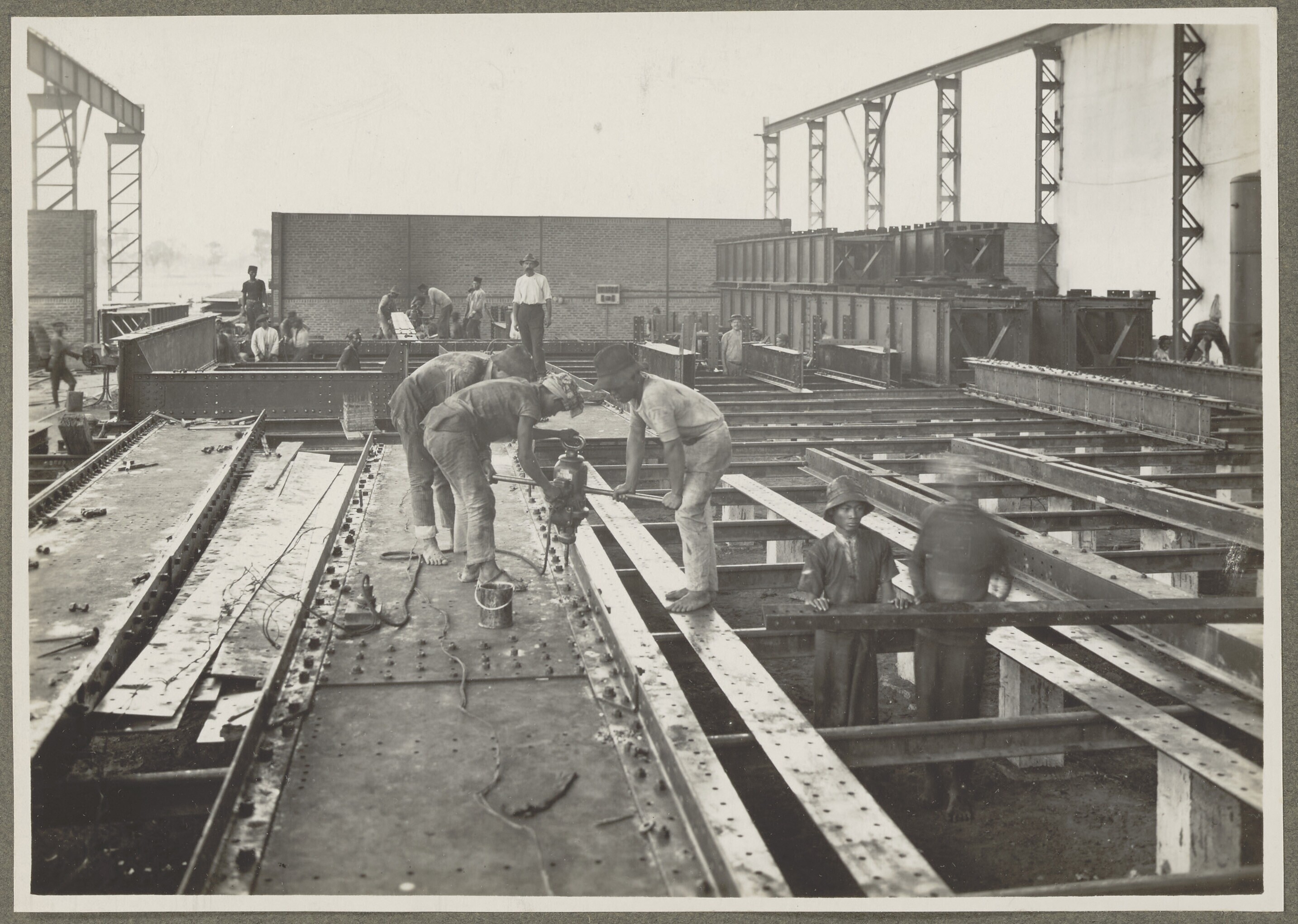 Arbeiders aan het werk in een metaalconstructie bedr...