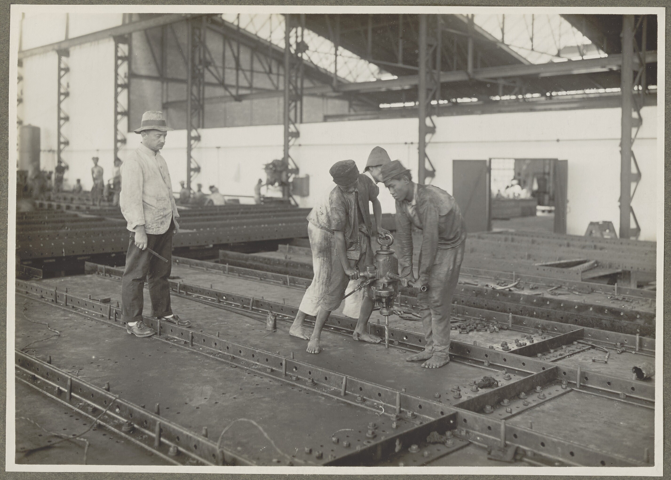 Arbeiders aan het werk in een metaalconstructiebedri...