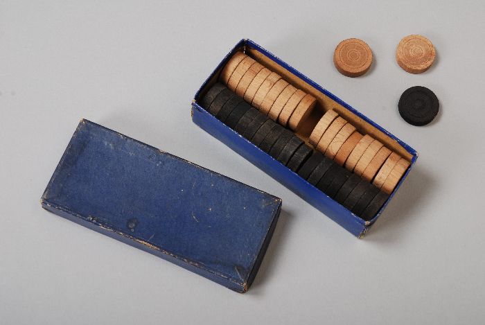Paarse doos met zwarte en witte damstenen