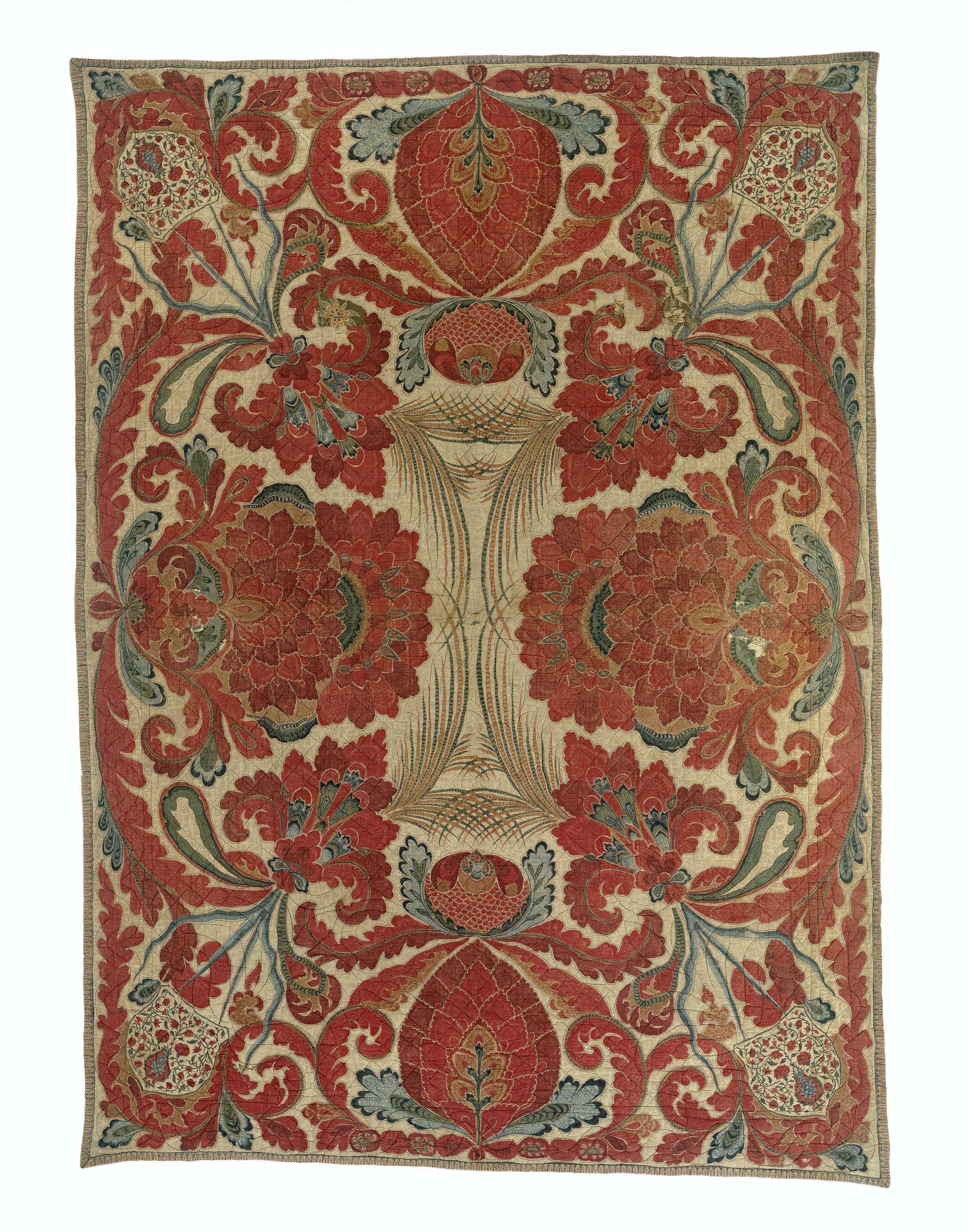 Deken van sits, gewatteerd en gevoerd met rode katoen