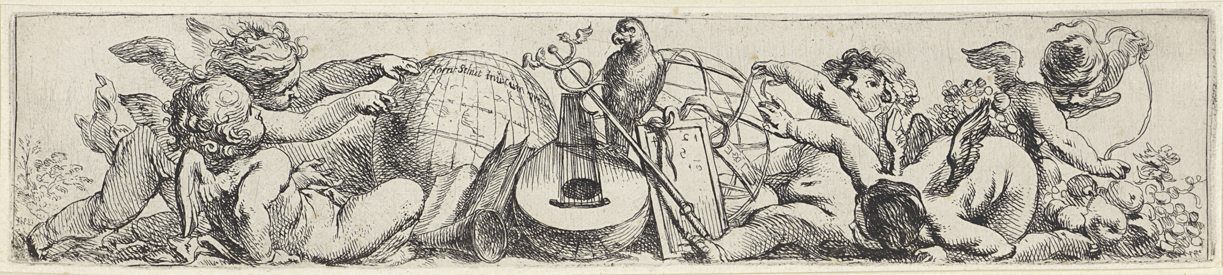 Vier putti, waarvan één met een helm en vaandel