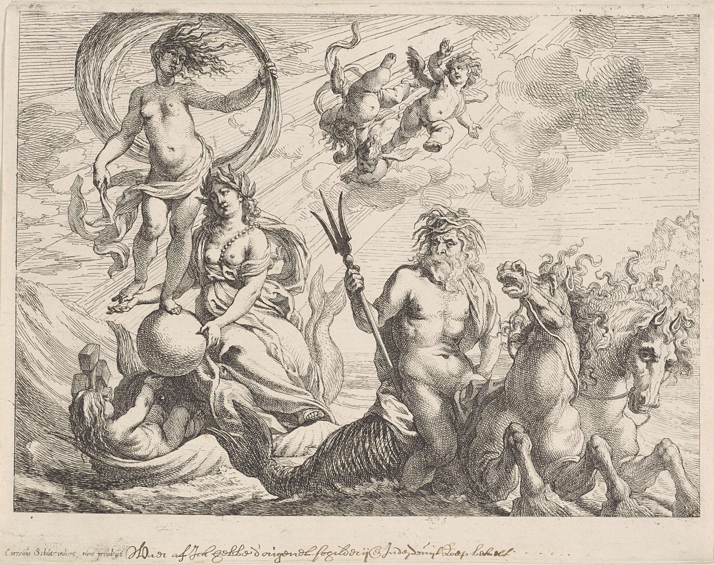 Neptunus met zijn paardenwagen op zee