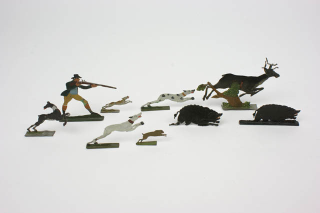 Jachttafereel met jager, hert, 2 zwijnen, haas, en 4...