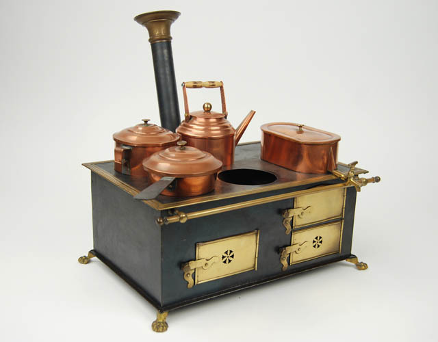 Fornuis met koperen pannen, ketel, deurtjes en pootj...