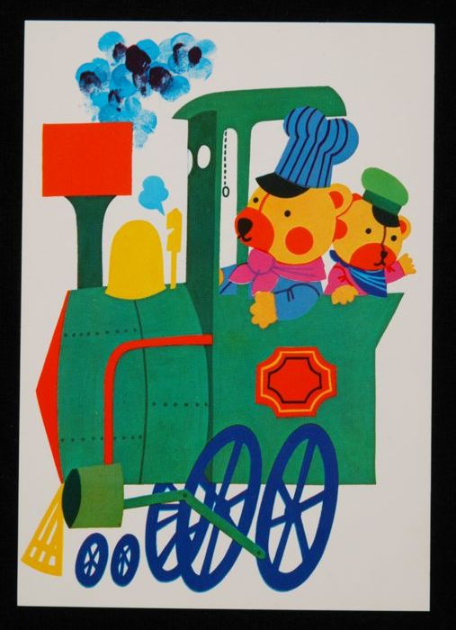 Prentbriefkaart voor het kind: twee beren in locomotief