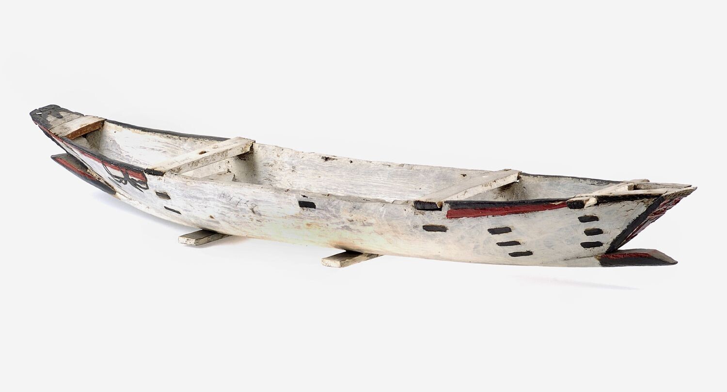 Model van een roeiboot met spitse boeg met schepriem