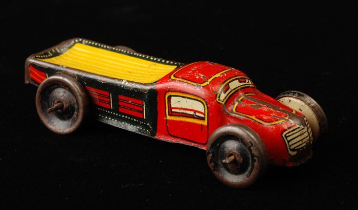 Vrachtauto in rood met gele lading