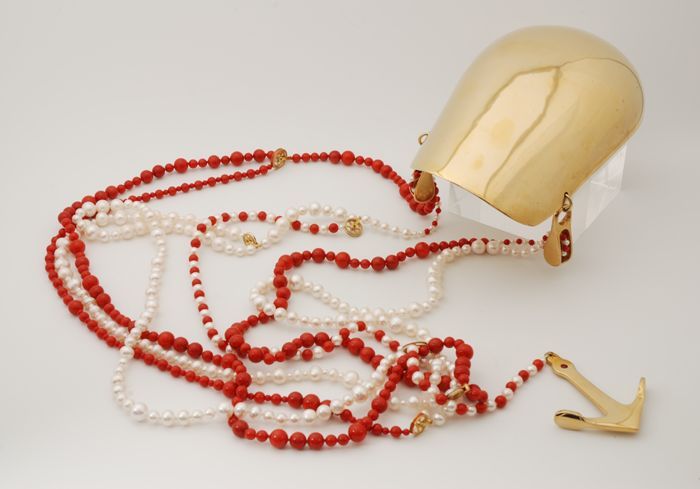 Goudkleurig epaulet met twee kettingen in rood en wi...
