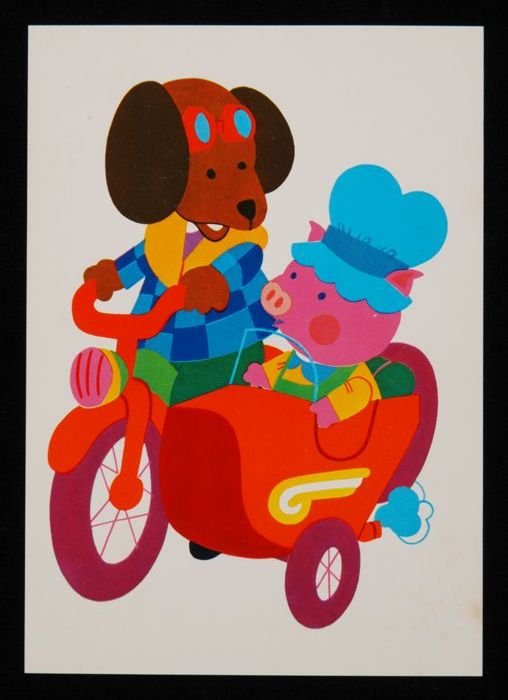 Prentbriefkaart voor het kind: hond en varken op mot...