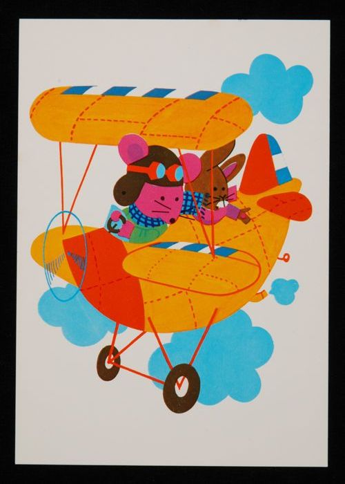 Prentbriefkaart voor het kind: muis en konijn in vli...