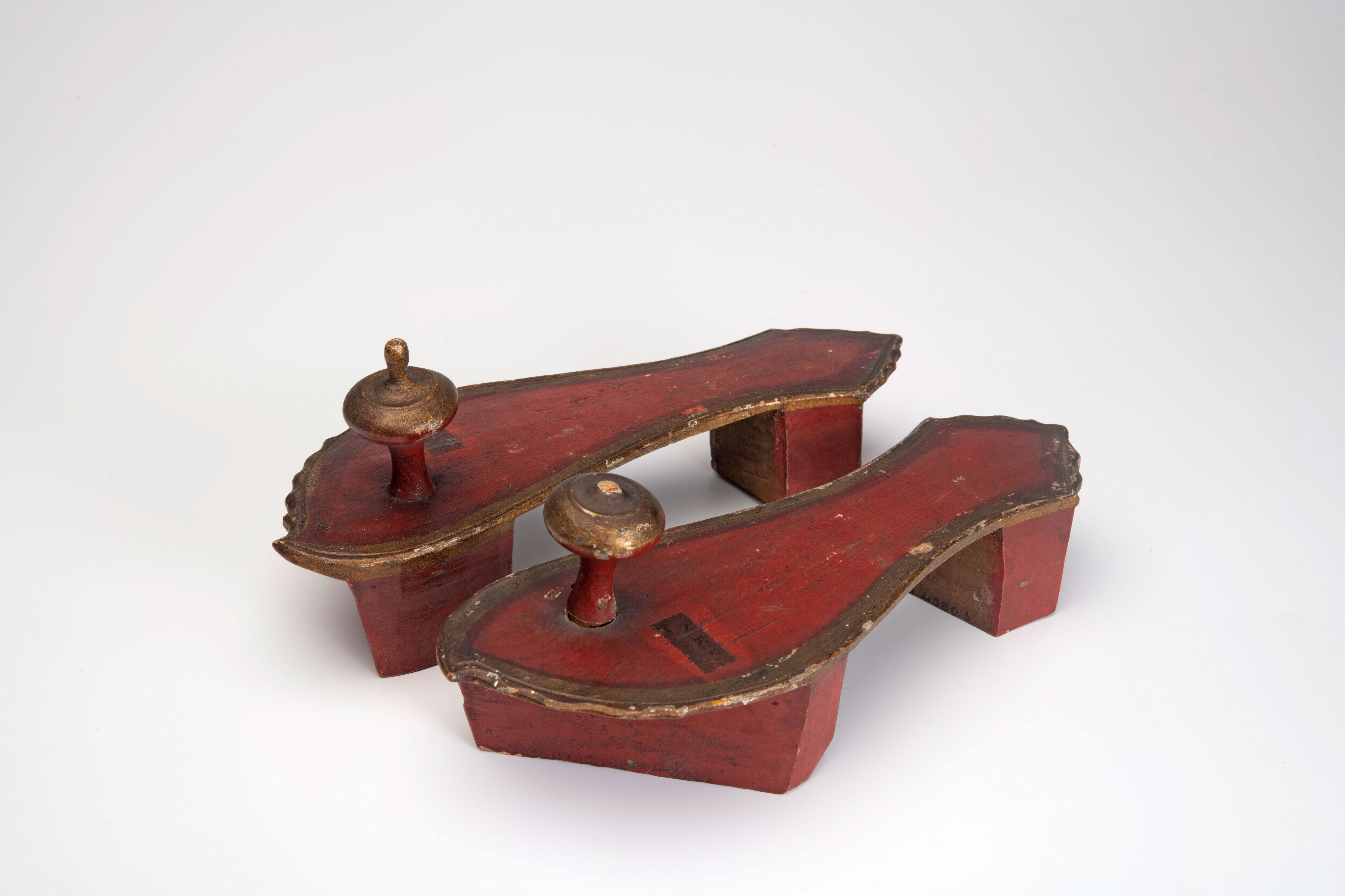 Paar roodgeverfde voetklossen met siersnijwerk